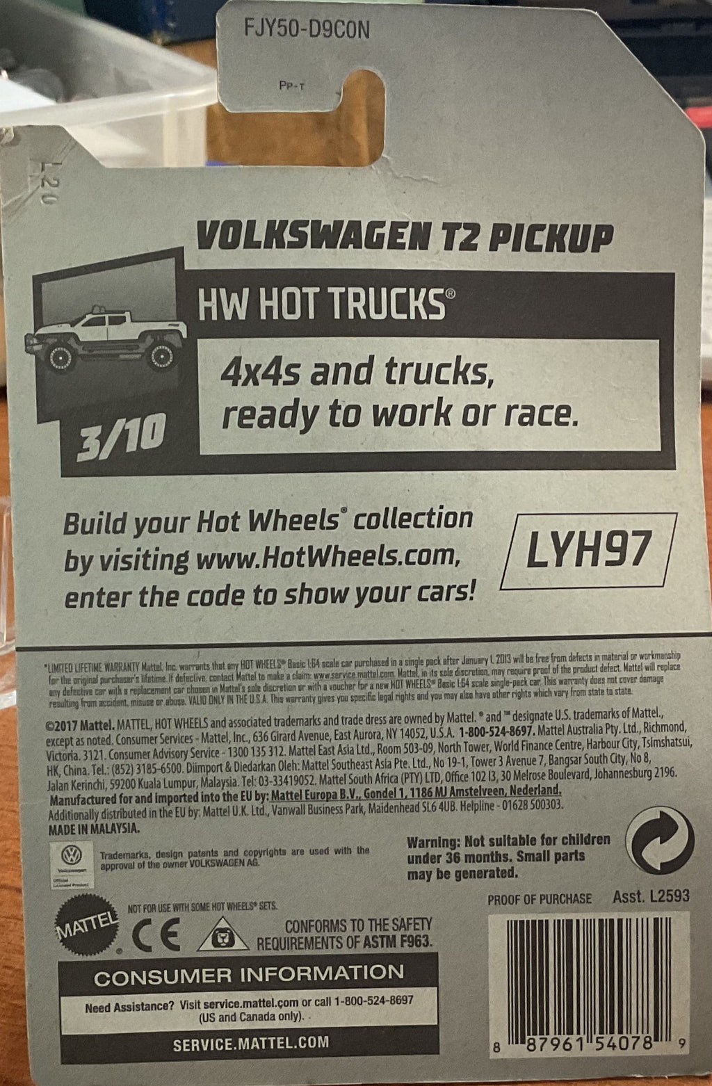 VOLKSWAGON T2 PICKUP, HW HOT TRUCKS, Wheels Toy Car, FJY50-D9C0N, Store #TY048